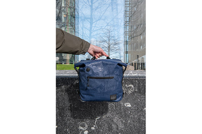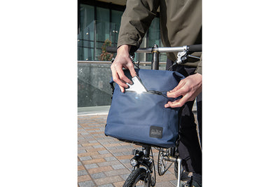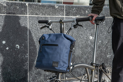 In stock and ready to ship! The Borough Waterproof Small in Navy is part of Brompton's range of waterproof bags - Completely impervious to water, this simple roll top bag provides protection for all your small essentials, even in the harshest conditions. The flexible design of this bag can be worn as a shoulder bag or a backpack, with just enough space for a day trip adventure. A zipped front pocket allows quick access for items on the go, the design of this bag has been completed with aluminum hardware for a stylish look. This bag is finished with a rubberized webbing handle, making it compatible with ALL Brompton handlebar types.