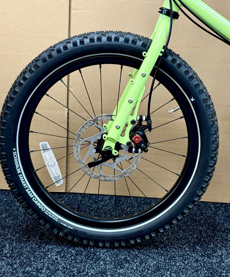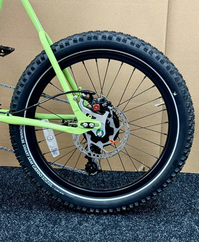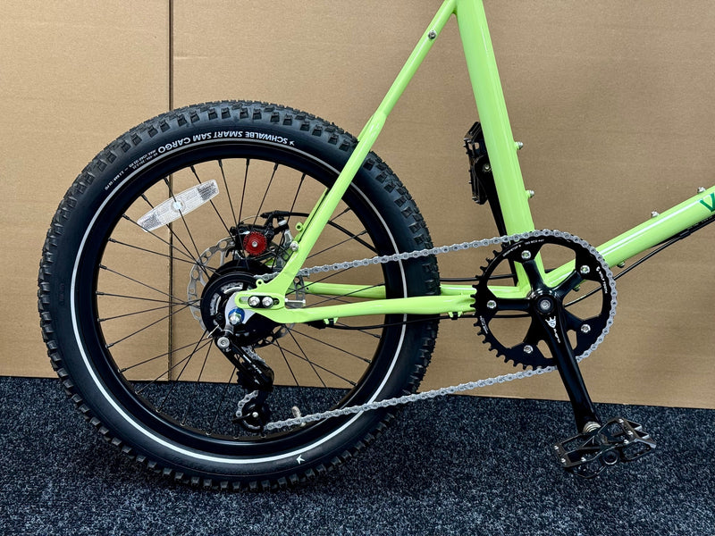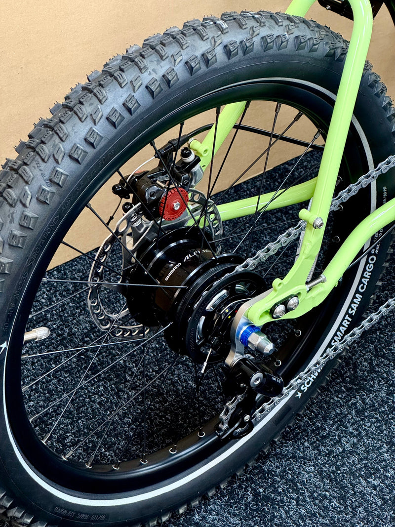 Wheels - Front wheel: Rhyde tubeless-ready 24-spoke rim, sealed center lock disc hub. Rear wheel: Rhyde tubeless ready 32-spoke rim, Shimano Alfine 8 internally geared hub with center lock disc brake. Tires: 20" X 2.35" Schwalbe Smart Sam Cargo